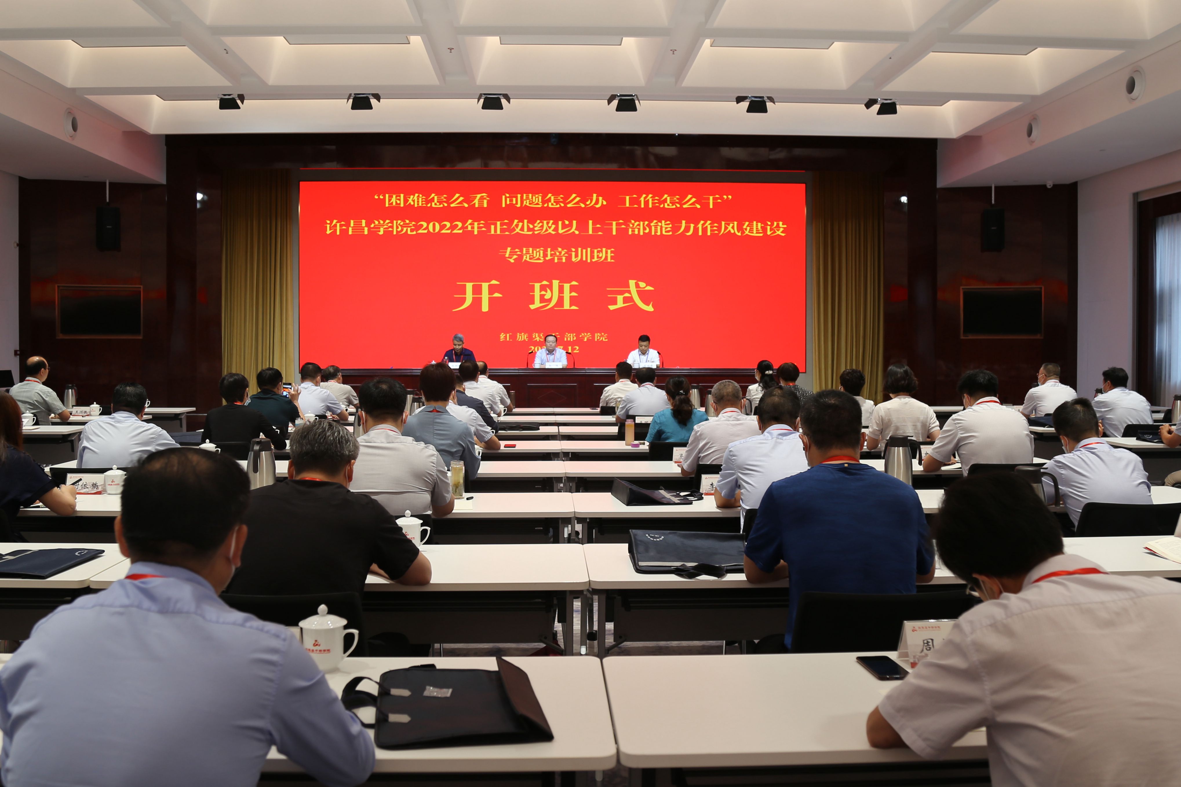 我校2022年正处级以上干部能力作风建设专题培训班在红旗渠干部学院举办,7月12日上午,培训班正式开班。红旗渠干部学院副院长石瑞峰,校党委书记郭涛,党委副书记、校长岳修峰,党委副书记孙海,副校长崔斌、潘春彩,纪委书记王东晓出席开班仪式。全校正处级领导干部参加开班仪式。仪式由岳修峰主持。